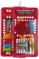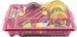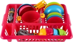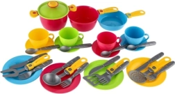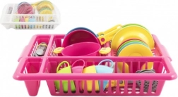 Veseli dječji kuhinjski set u praktičnom ocjeđivaču donosi sate kreativne zabave. Sadrži sve što mali kuhari trebaju: tanjuriće, šalice s tanjurićima, pribor za jelo, lonac s poklopcem i tave. Žive boje privlače pažnju i razvijaju maštu, finu motoriku i navike reda – nakon „kuhanja“ posuđe se jednostavno odloži u ocjeđivač kao kod mame.