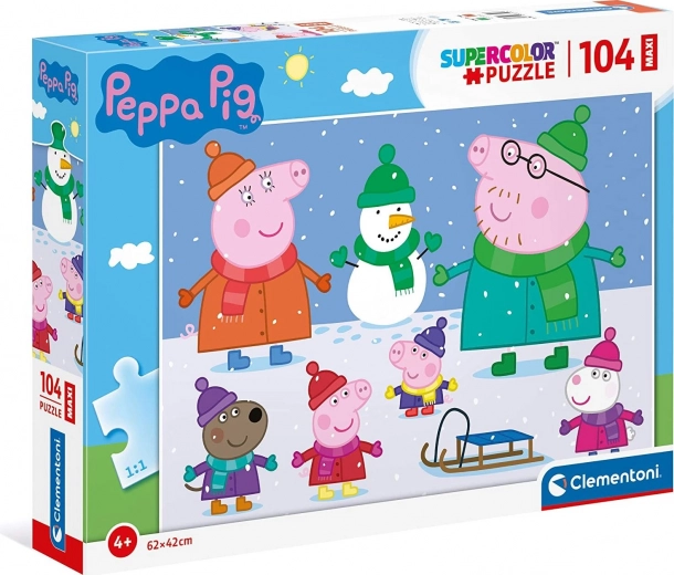 Dječje puzzle PEPA PRAŠČIĆ Zima MAXI 104 dijelova od Clementoni. SuperColor tisak, kvalitetan karton i dimenzije nakon slaganja cca 62 × 42 cm.