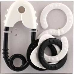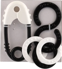 Ovaj set zvečki sadrži klasičnu sigurnosnu iglu i osmicu s prstenovima.