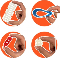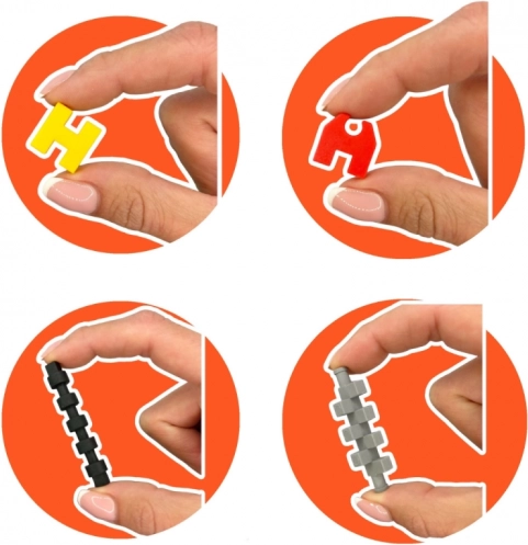 - Kockice različitih oblika (platforme, trokuti, prozorčići, ljestve, 3 vrste osovina), ilustrirane upute, vrećica za pranje u perilici posuđa, kartonska kutija
