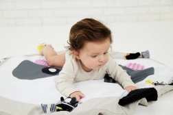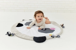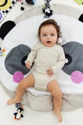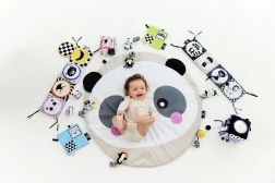 Otkrijte mekanu i sigurnu senzornu podlogu za bebe s motivom pande od GAGAGU. Kontrastni crno-bijeli uzorci podupiru razvoj vida, raznolike teksture na ušima i obraščićima razvijaju osjet dodira, a ušiveni šuškavi materijal stimulira sluh. Podloga je bez plastičnih dijelova, ugodno mekana i gusta za toplinsku udobnost, s praktičnim omčama za pričvršćivanje dodatnih igračaka.