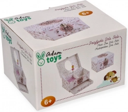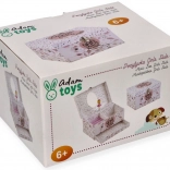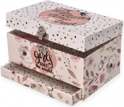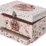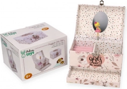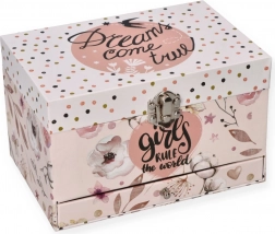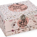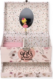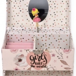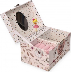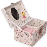 Ova nježna ružičasta kutija za nakit s cvjetnim i točkastim motivom skriva sve što vole male princeze: nakon podizanja poklopca zazvuči melodija, a balerina se zavrti na osi pred ovalnim ogledalcem. Unutra se nalazi praktično organiziran prostor s jastučićima za prstenje i pretincima za sitne dragocjenosti.