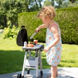 Roštilj je dizajniran s obzirom na lako premještanje zahvaljujući kotačićima i ručki, tako da se može postaviti u bilo koji dio vrta ili kućanstva. Također sadrži policu koja može smjestiti sve dodatke, što olakšava pospremanje i čini igru organiziranijom.