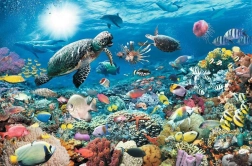 Ovaj puzzle prikazuje živopisan podvodni svijet prepun šarenih riba, kornjača i koralja, što ga čini vizualnim užitkom.