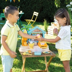 SMOBY plažni bar je kreativni dječji štand za igru prodavača i kupaca. Djeca mogu isprobati pripremu sladolednih kupova, smoothieja i voćnih ražnjića, ukrašavanje preljevima i posipima te naplaćivanje kupnje na funkcionalnoj blagajni. Realistični detalji potiču maštu, društvene vještine i finu motoriku.