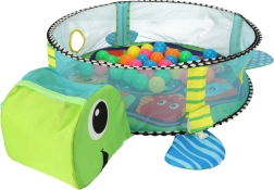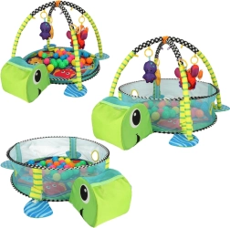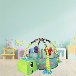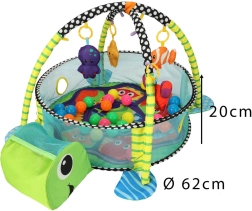 Edukativna podloga za igru kornjača s ogradicom i lopticama šarena je, mekana i multifunkcionalna podloga, idealna za djecu već od rođenja. Izrađena od visokokvalitetnih materijala, osigurava sigurnost i razvoj djeteta. Nije samo podloga za igru, već i bazen s lopticama koji pruža mnogo radosti i osjetilnih poticaja.