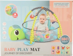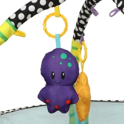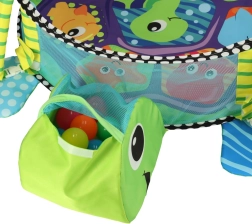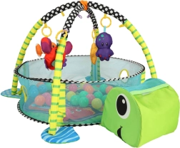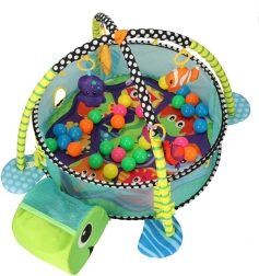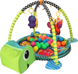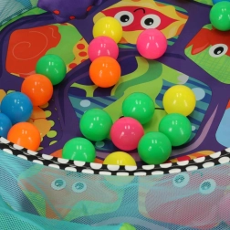 - Igračke i loptice: Podloga uključuje šarene i mekane igračke poput ribice, hobotnice, zvijezde i kutijice sa zrcalom. Dodatno, 30 plastičnih loptica u živim bojama stimulira djetetova osjetila.