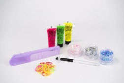 - 3 gela za bojanje kose, 3 sjajne posipke, gumice, kist, češalj