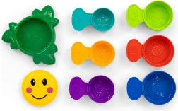 Sklopiva igračka za kadu Flower od Milly Mally. 6 šarenih čašica za slaganje, slaganje u toranj, kao kalupi za pijesak. Svaka od njih ima na dnu otvore, tako da kroz njih možete i prolijevati vodu, prosijavati pijesak za igru, na igralištu ili na plaži. Boje i reljefni oblici na čašicama pomažu pri učenju.