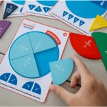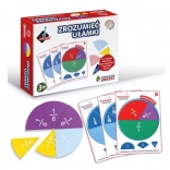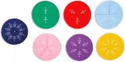 Set sadrži drvene elemente koji prikazuju razlomke 1/2, 1/3, 1/4, 1/5, 1/6, 1/8, 1/10, a set je dopunjen odgovarajućim radnim kartama.