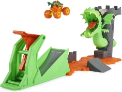 Uživajte u epskom showu s igraćim setom Monster Jam Dueling Dragon. Učitajte kamion u izbacivač, preskočite lavu i naciljajte na tornjić – preciznim doskokom porazite zmaja! Mehanizam se brzo resetira pa akciju možete ponavljati iznova i iznova.