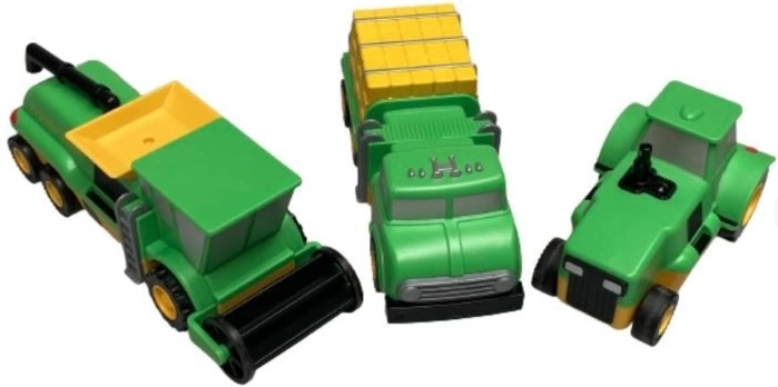 U kompletu su modeli traktora, kombajna i teretnog vozila s uklonjivim dijelovima. Robustan plastični materijal odolijeva svakodnevnoj igri, dok realistični detalji i natpisi poput „Popular Farms“ potiču tematske priče s farme.