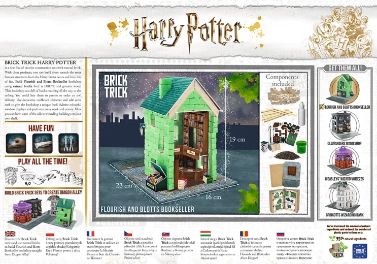 Stvorite kod kuće djelić čarobnjačkog svijeta – kultnu knjižaru Flourish i Blotts. Set BRICK TRICK HARRY POTTER koristi prave mini cigle, drvene letvice i kartonske dekoracije kako biste postigli detaljan, realističan rezultat. Ljepilo je topivo u vodi, pa model možete u bilo kojem trenutku rastaviti i ponovno sastaviti.