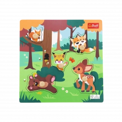 Drvena slagalica s živopisnom grafikom šumskih životinja osmišljena je tako da djecu zabavi i istovremeno razvija njihove vještine. Svaki je dio čvrst, lako se drži i opremljen je drvenim gumbom za jednostavno vađenje. Podloga ima izrezane oblike s crno-bijelim crtežom koji odgovara dijelu, što djeci pomaže u intuitivnom sparivanju.
