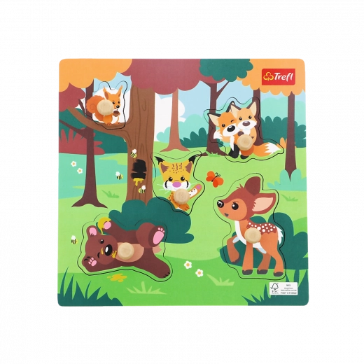 Otkrijte kvalitetne drvene puzzle s motivom šumskih životinja za najmlađe. Sadrže 5 izvadivih dijelova s drvenim gumbom i podlogu s označenim obrisima za lako slaganje. Ova igračka potiče razvoj fine motorike, učenje oblika i koordinaciju oko–ruka. Idealna opcija za djecu od 18 mjeseci.