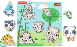 Ova kvalitetna drvena slagalica s umetkom s službenom licencom FISHER-PRICE donosi djeci zabavne motive džungle i intuitivno učenje. Podloga s urezanim obrisima i crno-bijelom grafikom sugerira gdje koji dio pripada, pa se djeca lako snalaze i vesele uspjehu.