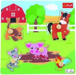 Otkrijte zabavnu i edukativnu igračku za najmlađe: drvene puzzle s motivom farme i pet dijelova s ručkicama. Izdržljivo drvo, lako držanje i jasne slike potiču prve vještine djeteta i radost slaganja.