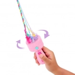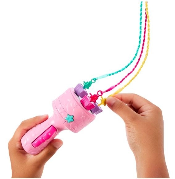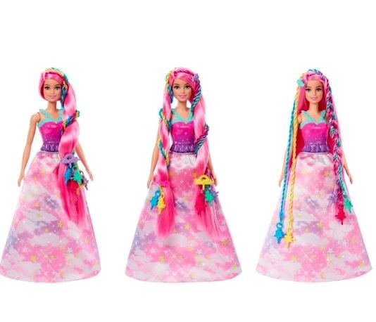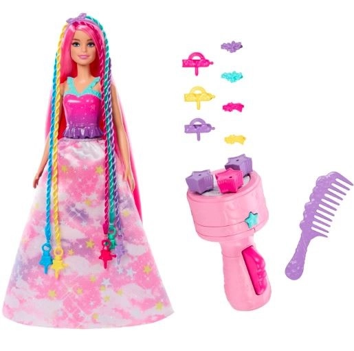 Lutka Barbie iz bajkovitog kraljevstva Dreamtopia ima ekstra dugu kosu s duginim pramenovima koji naprosto pozivaju na uređivanje. Dovoljno je umetnuti 2–3 pramena u alat za pletenje i jednim pritiskom izraditi očaravajuće uvijene frizure. Tri dugine kopčice drže frizuru na mjestu, dok šarene ukosnice dotjeruju završni izgled.