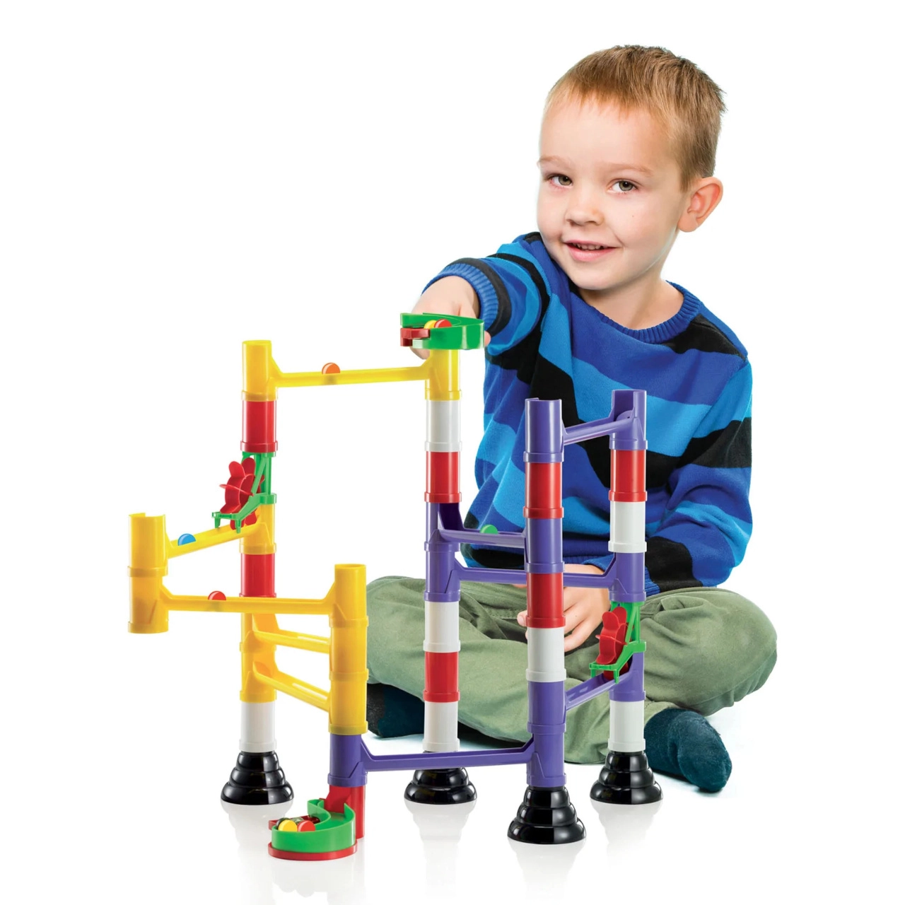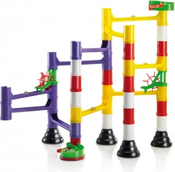 Modularne cijevi, stupići i tračnice precizno se uklapaju. Djeca brzo shvate logiku gradnje i mogu stalno mijenjati rutu kuglica.
