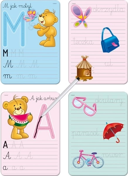 Set „Pišem i brišem – slova” motivira male školarce na trening pisanja u sigurnoj i razigranoj atmosferi. Djeca mogu pisati i krivo ili izvan linija – dovoljno je obrisati i pokušati ponovno. Razigrani vodič, medvjedić Krzyś, u učenje unosi radost i hrabrost.