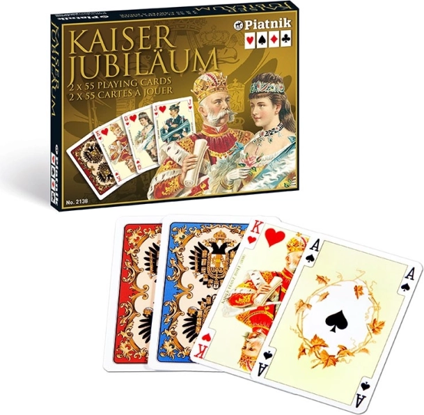 Carevske karte 'Kaiser' renomirane tvrtke Piatnik očarat će vas svojim klasičnim dizajnom, koji je bio omiljen već od prijeratnih vremena u regiji Galicije. Ovaj set sadrži dva luksuzna paketa karata, pružajući 54 plastificirane karte u svakom paketu s gramaturom 310 g/m² i dimenzijama 58 x 89 mm. Na aversu karata pronaći ćete portrete članova carske obitelji Habsburg, dok naličje nosi grb te obitelji.