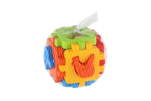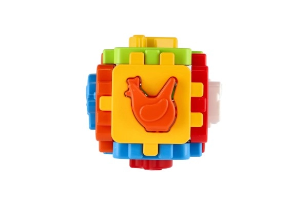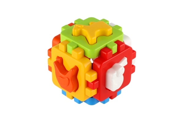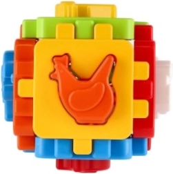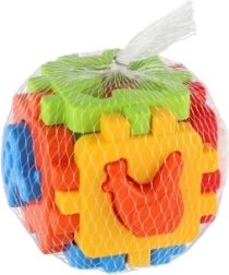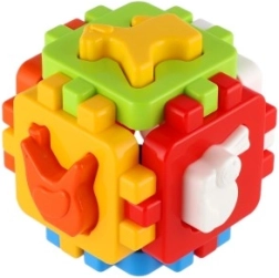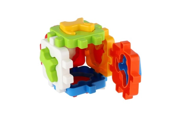Ova klasična umetaljka u mini izdanju ima šest obojenih stranica sa spojnim nazubljenim rubovima koje se lako sastavljaju u kocku. Uključeni su oblici za umetanje i sklopivi paneli, pa dijete može kocku rastavljati i ponovno sastavljati, čime razvija koordinaciju ruka–oko i prostornu maštu.