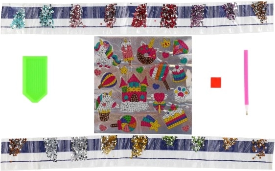 - U pakiranju se nalazi: list naljepnica, olovka za nanošenje kamenčića, posudica za kamenčiće, vosak i set raznobojnih kamenčića.