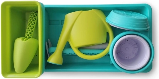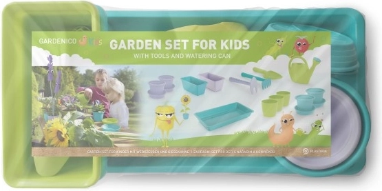 Set za djecu s alatom za male vrtlara idealna je zabava! Sadrži sve potrebno za uzgoj začinskog bilja i drugih biljaka. Set savršeno potiče interes djece za prirodu koja nas okružuje. Set sadrži: 4x lonac za cvijeće s podloškom u 2 veličine, 3x omot/košuljica za lonac, 2x mini sandučić/žardinjeru, 1x podložak, 1x zalijevač, 1x lopatica, 1x grabljice, 1x motičica.