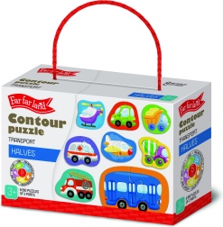 Otkrijte svijet prijevoznih sredstava s obrisnim puzzlama dizajniranima posebno za malu djecu. Svaka od 8 slika sastoji se od samo dva čvrsta dijela, što olakšava prve korake u slaganju i jača samopouzdanje malih igrača. Zahvaljujući kontrastnim oblicima i jasnim motivima djeca brzo shvaćaju princip povezivanja.