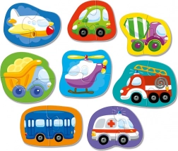 - 8 zasebnih mini puzzli s obrisima prijevoznih sredstava