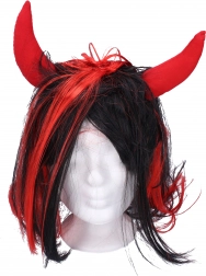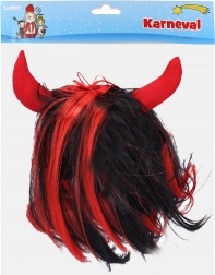 Stilna đavolska perika s crnom kosom i crvenim pramenovima, dopunjena tekstilnim crvenim rogovima. Idealna za sv. Nikolu, maškarade i tematske zabave. Jednostavno postavljanje i trenutačan pakleni efekt.