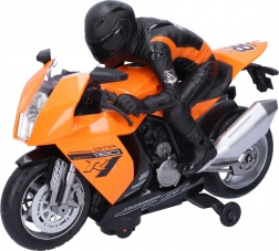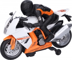Uživajte u akcijskoj vožnji sa stilnim trkaćim motorom duljine 28 cm s figuricom vozača. Nudi svjetlosne i zvučne efekte, realističan dizajn i dvije varijante boja – narančastu i bijelu. Savršeno za male trkače i ljubitelje motora.