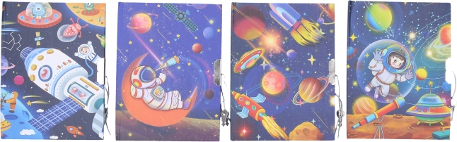 Stilizan dječji spomenar s motivom svemira za tajne poruke, želje i crteže. Stranice bez linija, praktična brava i kompaktna dimenzija 11×15 cm. Dostupan u 4 različita motiva.
