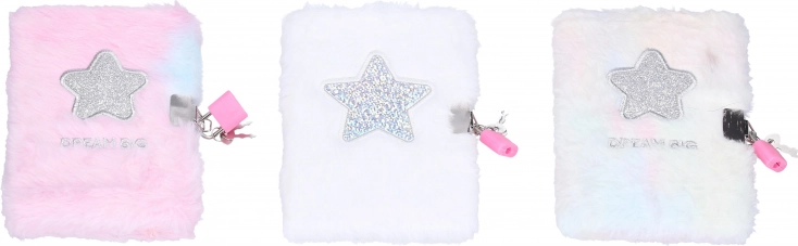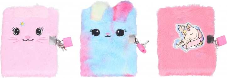 Slatki dnevnik s plišanim omotom i bravicom u praktičnom formatu 10,5 × 15 cm nudi 70 neliniranih stranica za pisanje i crtanje. Dostupan je miks motiva.