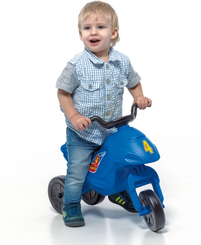 Lagana trokotačna guralica SUPER BIKE mini u plavoj boji za prve vožnje. Nudi stabilnost zahvaljujući 3 kotača, kompaktne dimenzije 57×28×41 cm i nosivost 25 kg.