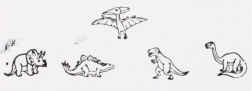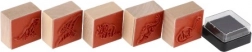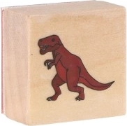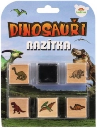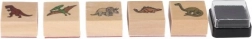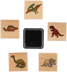 Pet drvenih žigova s motivima dinosaura i jastučić s tintom u pakiranju – dovoljno je otvoriti i žigosati.