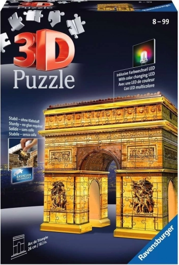 Uživajte u gradnji slavnog pariškog Slavoluka pobjede u 3D izvedbi s noćnim efektom. Zahvaljujući LED osvjetljenju i tehnologiji EASYCLICK stvorit ćete fascinantan model koji će oduševiti svakog ljubitelja slagalica.