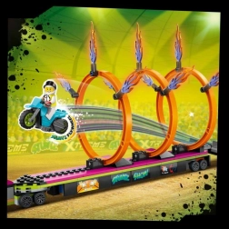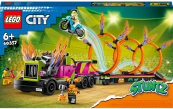 Izvedi zapanjujuće skokove i prolaze kroz vatrene obruče! Ovaj akcijski set iz serije LEGO City Stuntz donosi sve za napet show: robusni kamion s ravnom prikolicom, preklopnu rampu za start i tri podesiva obruča s plamenovima za različite razine težine. Motor sa zamašnjakom ispaljuje se nevjerojatnom brzinom i zabava može početi.