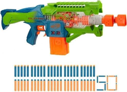 Pokrenite akcijsku zabavu s bacačem NERF ELITE 2.0 DOUBLE PUNCH! Ovaj motorizirani bacač ima 2 cijevi i 2 spremnika za neprekidnu paljbu. U pakiranju se nalazi 50 strelica, pa vam je municija uvijek pri ruci. Uživajte u brzoj paljbi s pokretnim cijevima i dugom izdržljivošću za igru na otvorenom i u kući.