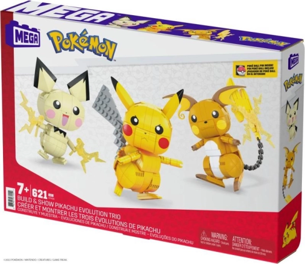 Pripremi se za bitku s građevnim setom MEGA Construx Izgradi i izloži Pikachua i njegovo evolucijsko trojstvo. Ovaj set uključuje kompletnu evolucijsku liniju Pichua, uključujući Pikachua i Raichua, od kojih svaki ima zglobne udove i opremljen je vlastitom posebnom moći. Posebni dijelovi koji pristaju u Pichuove ruke predstavljaju električnu snagu, dok su Pikachu i Raichu opremljeni svojim snažnim potezima. Sve to zajedno stvara nevjerojatno uvjerljivo iskustvo slaganja. Idealno za graditelje od 6 godina naviše.