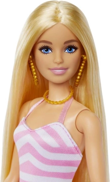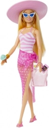 Lutka Barbie nosi ružičasto-bijeli prugasti kupaći kostim i moderan proziran saroong s točkicama koji dodaje eleganciju.