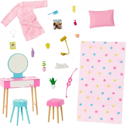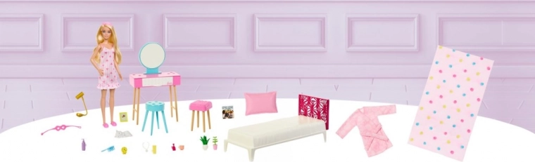 Ova bogato opremljena sobica s lutkom Barbie pretvara svaku igru u opuštajući užitak i zabavne priče. U kompletu su krevet s pokrivačem, noćni ormarić i toaletni stolić sa zrcalom, zahvaljujući kojima djeca lako odigraju jutarnje pripreme i večernje umirivanje.