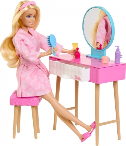 Barbie se može počešljati, urediti i pripremiti za dan. Ne nedostaju češalj, bočice i ladica za sitnice za uredno pospremanje.
