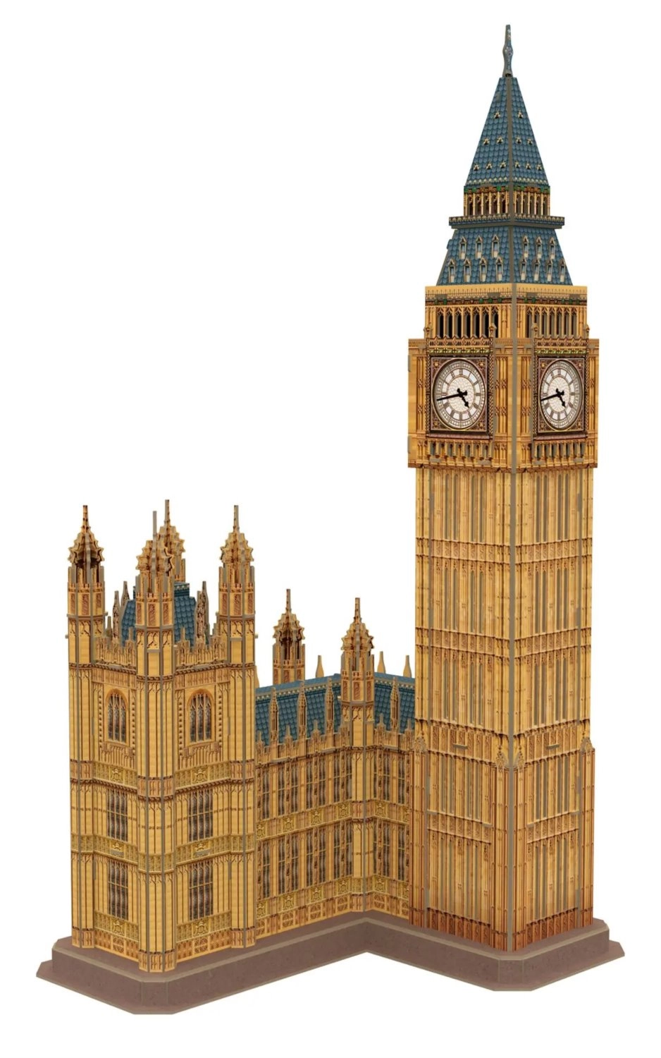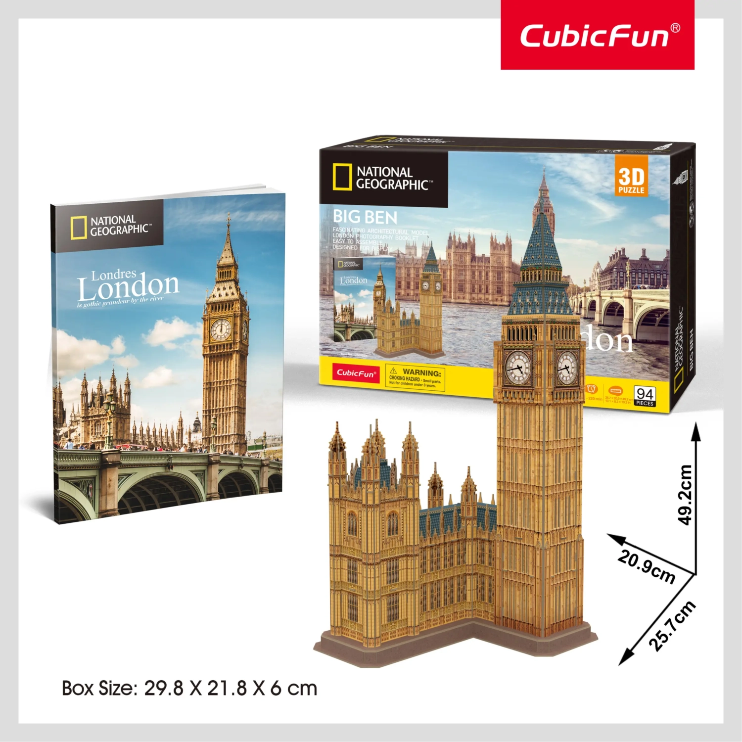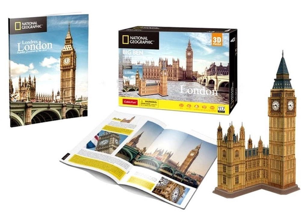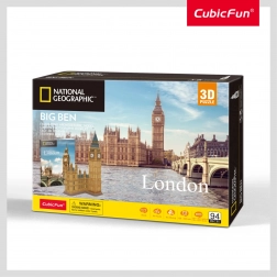 Ikonični Big Ben kao realistične 3D puzzle NATIONAL GEOGRAPHIC od CUBICFUN-a. Dijelove od čvrste 3 mm pjene s laminiranim tiskom složit ćete bez ljepila i škara. Okvirno vrijeme izrade 120–220 minuta, dimenzije gotovog modela 25,7 × 20,9 × 49,2 cm. Dio pakiranja je i putni vodič po Londonu (EN). 94 dijela jamče odličnu zabavu i elegantnu dekoraciju.