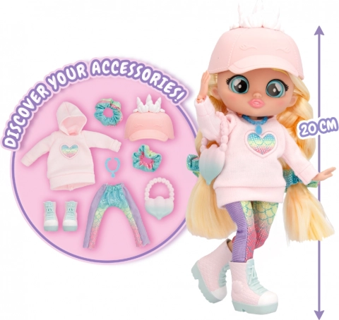 Raspakiravanje je zabavno! Okrenite posebni tubus – originalnu kutiju koja služi kao stylish ormar – i otkrijte više od 9 dodataka: dijelove outfita, torbicu, obruč ili kapu, par cipela s čarapama i BFF ogrlicu. Svaki je detalj osmišljen da potakne maštu i razvije osjećaj za stil.