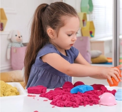 Igra s kinetičkim pijeskom razvija finu motoriku i kreativno razmišljanje djece. Posebna tekstura i plastična struktura pijeska pružaju iznimno ugodan taktilni doživljaj. Prelijevanje pijeska djeluje opuštajuće i umirujuće.