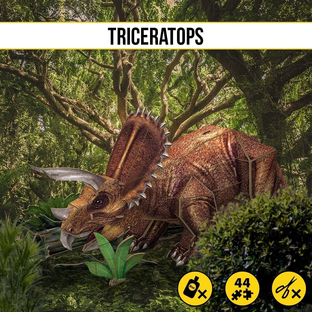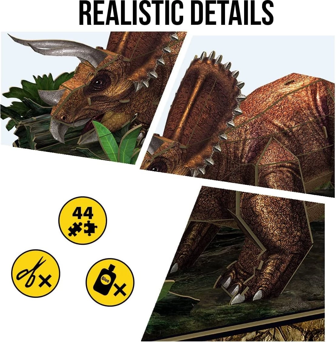 Set 3D slagalica s dinosaurima. Model triceratopsa od 44 dijelova koji možete sami sastaviti. Ove 3D slagalice dinosaura izrađene su od prethodno izrezanog papira i pjenaste ploče, koja je sigurnija od metala i drva, realističnija i lakša od plastike. Ilustrirane upute omogućuju malim graditeljima da sami sastave modele.