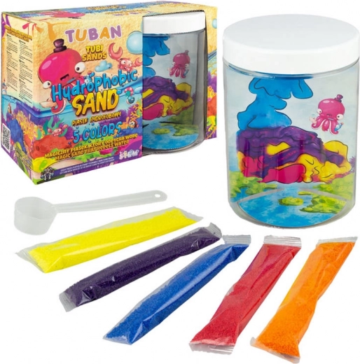 Čarobni pijesak TUBAN prekriven je posebnim slojem zahvaljujući kojem se ne moči – čak i nakon duljeg boravka u vodi ostaje suh. Idealan je za razigrano učenje i sigurne eksperimente tijekom kojih djeca promatraju hidrofobni efekt i stvaraju maštovite podvodne konstrukcije.