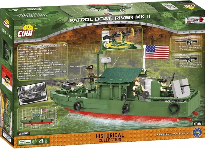 Patrolni čamac PBR ikona je sukoba u Vijetnamskom ratu — lagan, brz i plitkog gaza zahvaljujući laminatnom trupu i vodenom mlaznom pogonu. Replika u ovom setu vjerodostojno prikazuje njegove oblike, opremu i bogate detalje, uključujući dvostruku lafetu M2HB 12,7 mm na pramcu, stražnje naoružanje i opremu posade. Sve upotpunjuje tekstilna cerada koja modelu daje autentičan izgled.
