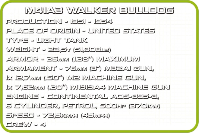 Laki izviđački tenk M41A3 Walker Bulldog ističe se brzinom i solidnim oklopom. Ovaj kvalitetni COBI set vjerno prikazuje njegove karakteristične oblike, uključujući dugi top, detaljnu kupolu i realistične gusjenice. Izdržljivi, postojani otisci osiguravaju da će model izgledati odlično i nakon dugih sati igre.